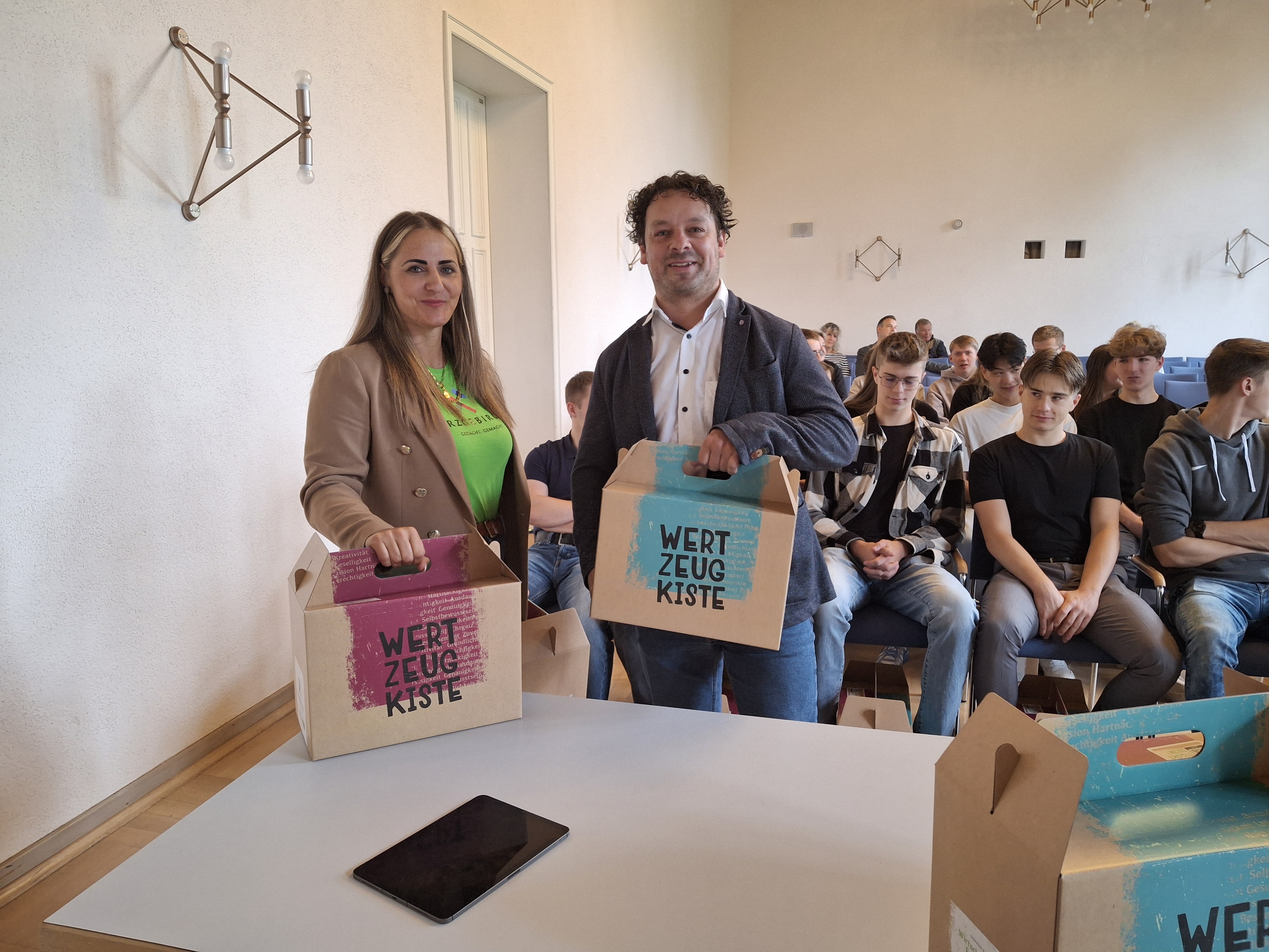 Am Mittwoch, den 11.06.2025, fand gemeinsam mit der Wirtschaftsförderung Erzgebirge und im Beisein eines Filmteams des MDR (Mitteldeutscher Rundfunk) im Rahmen der Bekanntgabe der Abiturnoten die Übergabe der sogenannten Wertzeugkisten am Johann-Gottfried-Herder-Gymnasium in Schneeberg statt. Zuerst sprach die Schulleiterin Adlin Elle ein paar einleitende Worte vor den ca. 53 anwesenden Schülern. Danach erläuterte Cindy Britsche, die Geschäftsbereichsleiterin für Berufs- und Studienorientierung der Wirtschaftsförderung Erzgebirge GmbH die Idee und den Hintergrund zu diesem bereits seit 2018 durchgeführten Projekt. Sie sprach über den Karrierestandort Erzgebirge, die hiesigen beruflichen Möglichkeiten und Perspektiven und warb für das Erzgebirge als Zuliefer- und Technologiestandort mit Zukunftsperspektive. Der Inhalt der Kiste wurde ausgepackt und vorgestellt, welcher die Vielfalt an Branchen und Materialien aufzeigen soll, mit denen hier gearbeitet wird.